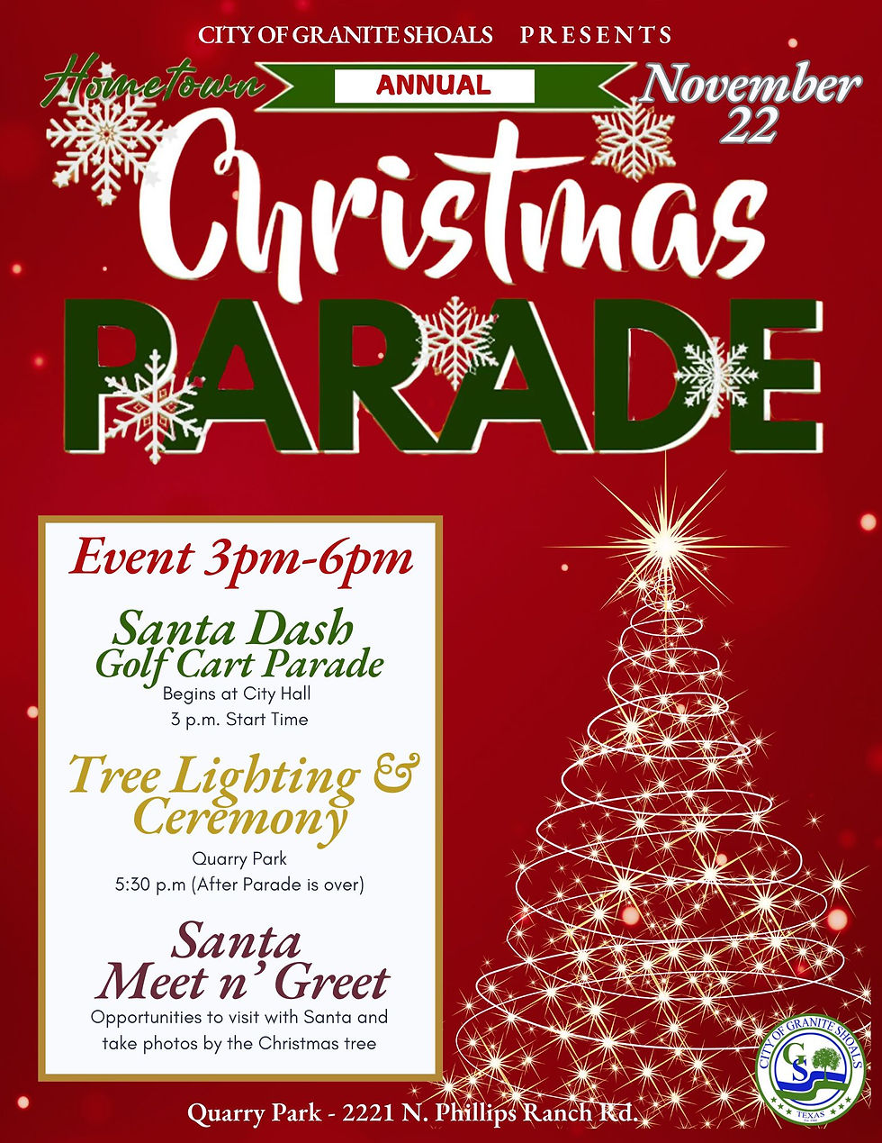 🎄 Kick off the holiday season with a dazzling Christmas Parade - SANTA DASH - will weave through the heart of Granite Shoals! Check the map for stops along the way. Staging for the parade will start at 2:30PM and will depart from City Hall at 3:00PM.